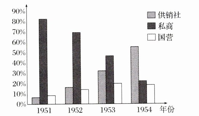 材料二 社会主义改造、建设时期,供销社为新中国建设事业作出了突出贡献。1950至1953年南阳县供销社系统向农村供应了小麦、玉米等27种生活资料,供应铁锨、镰刀、犁辕等15种生产资料,并开始供应农药、化肥、药械及新式农具等。同时,为国家收购和为农民推销农副产品,如土布、活猪、烟叶、棉花共20余种。1953年南阳县遭受罕见霜灾,供销合作社系统受国家委托,以低价向灾民供应粮食,全年共代销粮食约1500万斤。下图为1951 - 1954年供销社、私商、国营在南阳县商品流转额中的比重变化情况。