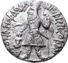 如图是贵霜帝国时期的钱币。贵霜帝国存在于约1—3世纪中亚和南亚地区。图中钱币上的铭文是希腊语,人物是贵霜国王。