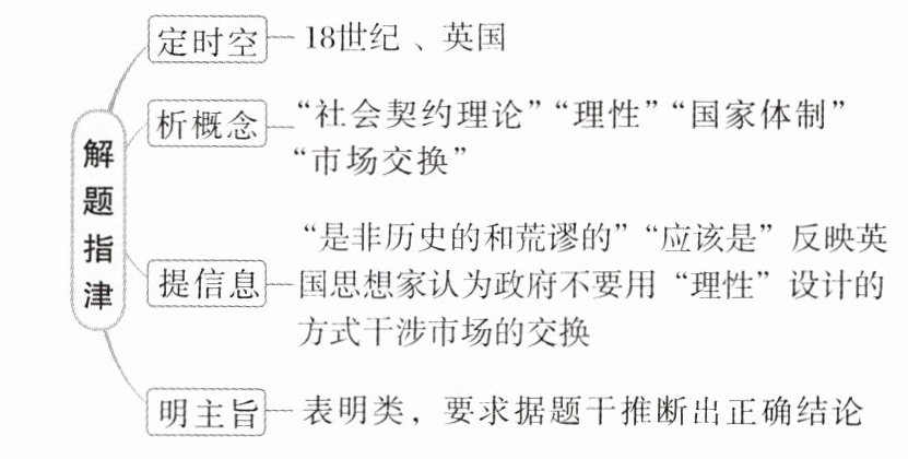 典例(2022·山东卷,12)18世纪的一些英国思想家认为,以自然状态和社会契约理论来描写和设计未来社会的图景,用理性来设计未来的国家体制,是非历史的和荒谬的……未来的社会,应该是每个人都参与到市场交换活动之中,通过市场、法律和道德三大基本要素来实现“文明和改善”的社会。这表明他们( )