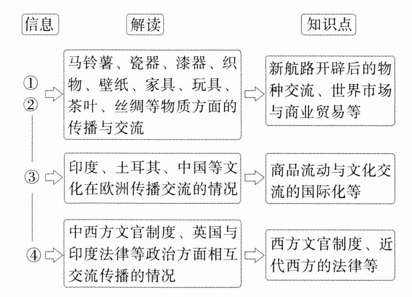 根据审题环节归类出来的各种信息,结合所学知识,我们可从以下角度撰写短文:结合物质类史料阐述文明互鉴,或结合思想文化类史料阐述文明互鉴,或结合制度类史料阐述文明互鉴。