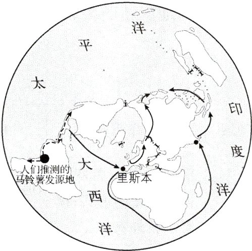 ①马铃薯主要传播路径示意图(虚线代表1492年哥伦布探险以前,实线代表16世纪以后)