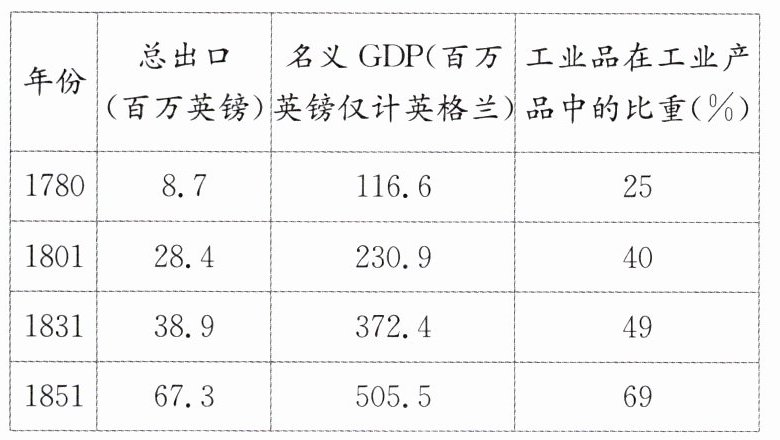 解读 材料一中列举了富含煤、铁等自然资源的新城市,材料二反映了英国工业品出口比重持续上升。