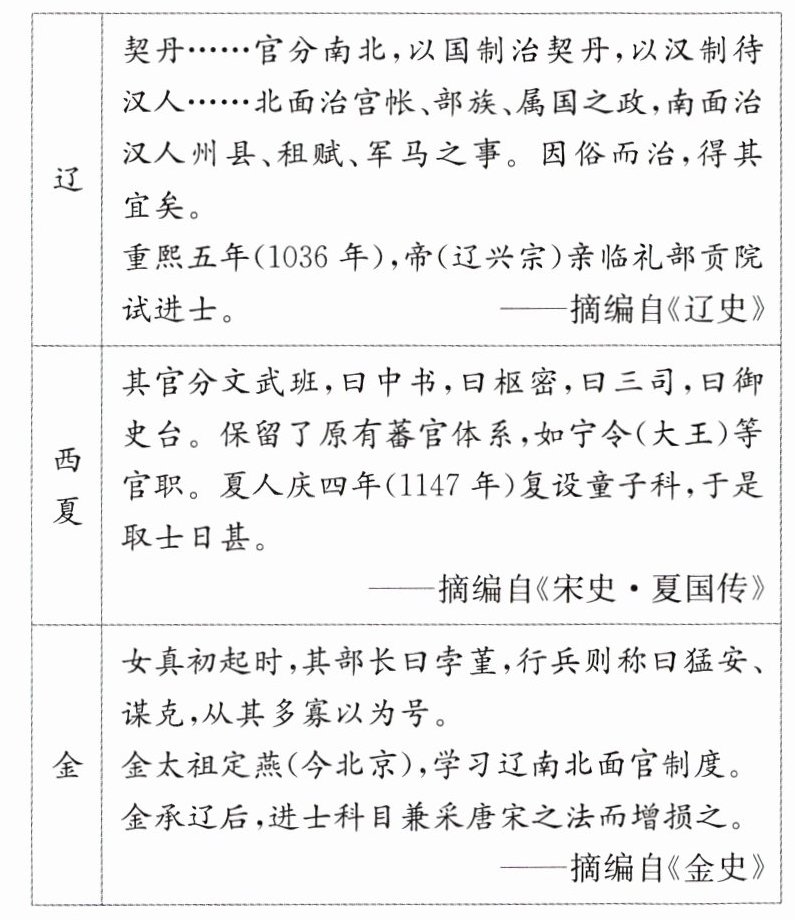 思考 根据材料和所学知识,比较辽、西夏、金制度的相同之处,并从民族政权并立与民族交融角度,谈谈你的认识。