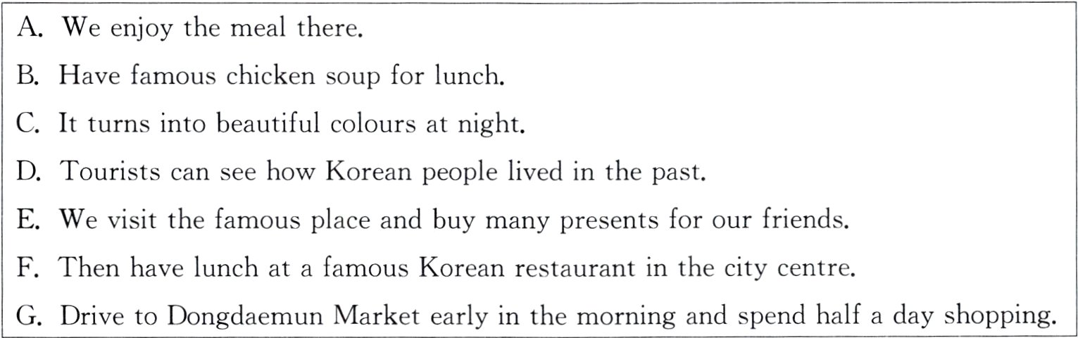 Day 1 Our guide will meet you at Incheon International Airport in the morning. Check in(登记入住)at the five - star King Hotel. 1. ______ Enjoy the beautiful scenery at the Banpo Bridge over the Han River. 2. ______ And then enjoy Korean seafood near the river.
