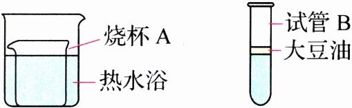 10. (2024·江苏盐城模拟改编)将5 g大豆研碎放入烧杯并加入10 mL己烷(一种有机溶剂),振荡静置一会儿,取上层清液于烧杯A中进行热水浴,得到大豆油。将大豆油转移至试管B中,加水振荡静置,现象如右下图所示。下列说法不正确的是 ( )