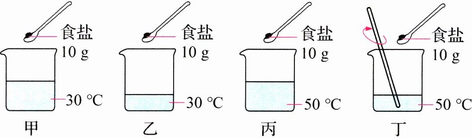 B 【解析】探究温度对食盐溶解速率的影响,除温度不同之外,其他条件都应该是相同的,甲和丙,除温度不同之外,其他条件是相同的,可用于探究温度对食盐溶解速率的影响。故B符合题意。