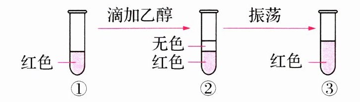 A 【解析】溶液是均一、稳定的混合物,试管②中液体分层,不均一,不是溶液,故A错误;试管②中分层的液体,乙醇处于上层,水处于下层,说明乙醇的密度比水的小,故B正确;试管③中的液体全都变为红色,且不分层,该现象说明乙醇能溶解在水中,形成均一、稳定的混合物,故C正确;在红墨水形成的溶液中滴加酒精,仍能形成溶液,说明溶液可以由多种物质组成,故D正确。