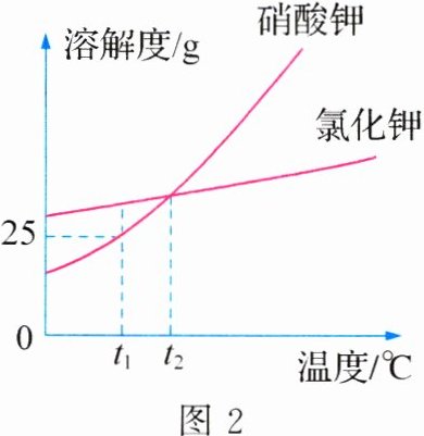 5. 新素养 科学思维 (2024·内蒙古)t₁℃时,将等质量的硝酸钾和氯化钾分别加入盛有100 g水的两个烧杯中,充分搅拌后如图1所示,硝酸钾和氯化钾的溶解度曲线如图2所示。下列说法不正确的是 ( )