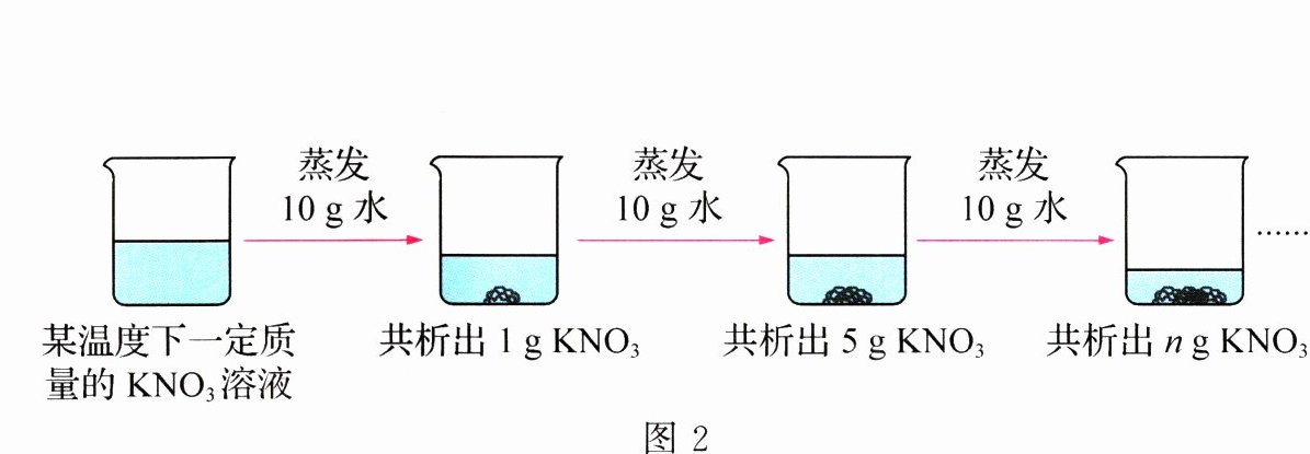 (4)某温度下,将一定质量的KNO₃溶液进行恒温蒸发结晶,过程如图2所示,则蒸发前原溶液是________(填“饱和”或“不饱和”)溶液,n的数值是________。