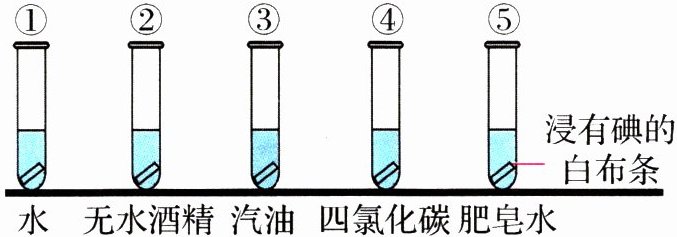 13. 新素养 科学探究与实践 小明陪妈妈到医院输液,不小心将护士手中的盘子打翻,碘酒洒在了小明的白衬衣上,白衬衣上出现了一大块紫黑色的痕迹。为找到去掉白衬衣上痕迹的最好方法,小明与几位同学进行了探究,提出了下列几个方案并进行实验:① 用水洗;② 用无水酒精洗;③ 用汽油洗;④ 用四氯化碳洗;⑤ 用肥皂水洗。请你与小明一起探究,并回答下列问题。