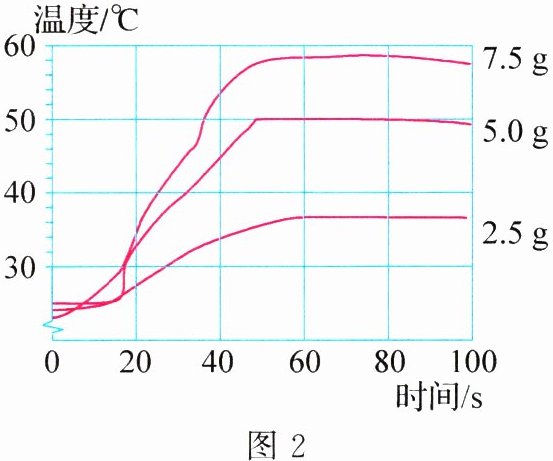 (2)两位同学又在20℃时,称取2.5 g、5.0 g、7.5 g NaOH固体,分别加入3个小烧杯中(烧杯中的水相同),均完全溶解。通过数字化实验测得它们在溶解过程中溶液温度的变化情况如图2所示。根据图象,可得出的结论是 ____________________________ 。