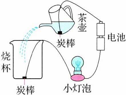 4. 新趋势 学科融合 茶壶中盛有食盐水,将电池、小灯泡和炭棒用导线连接起来,如右图所示。当用茶壶向烧杯中倒水时,小灯泡就会亮起来;当停止倒水时,小灯泡就熄灭了。