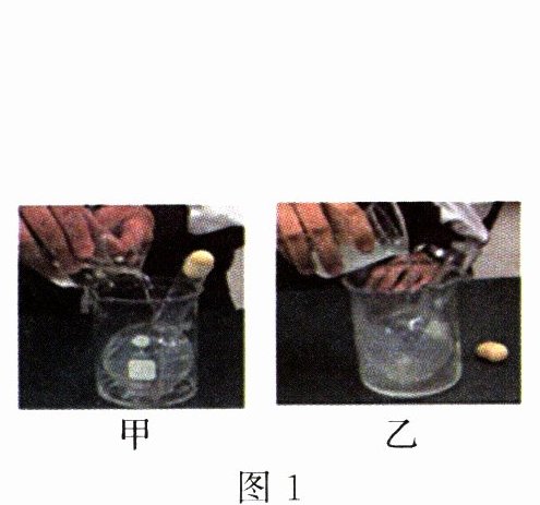 3. 20℃时,两位学生分别将刚刚配制的蔗糖和氢氧化钠溶液倒到瓶口塞有鹌鹑蛋的烧瓶外壁。倾倒蔗糖溶液后,鹌鹑蛋无明显变化(如图1甲所示);倾倒氢氧化钠溶液后,鹌鹑蛋会缓慢上升,并从瓶口“吐”出来(如图1乙所示)。