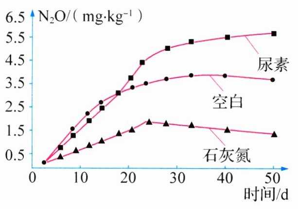 7. <思想方法 对比法> (2024·广东清远模拟)$\mathrm{N_2O}$ 是一种温室气体,主要由土壤中氮元素在微生物作用下生成。兴趣小组开展以下探究:在相同条件下,三个土壤培养瓶中,一个不施加任何氮肥,作为空白对比实验;另两个分别加入含相同质量氮元素的尿素[$\mathrm{CO(NH_2)_2}$]、石灰氮($\mathrm{CaCN_2}$,一种肥料)。测定不同时间后培养瓶内气体中 $\mathrm{N_2O}$ 的含量,结果如右下图所示。下列说法正确的是 ( )