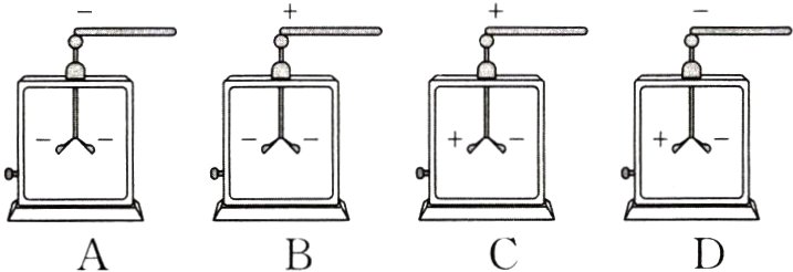 3.(2024·湖北)将毛皮摩擦过的橡胶棒接触验电器,能正确表示橡胶棒和验电器金属箔片带电情况的图是 ( )