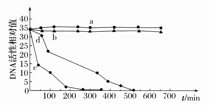 (1)黑暗处理组为TiO₂/DNA体系,设计黑暗处理对照组的目的是证明TiO₂不会损伤DNA。紫外光处理曲线b(UV/DNA体系)说明没有TiO₂(催化剂)的条件下,紫外光对DNA的损伤很小。