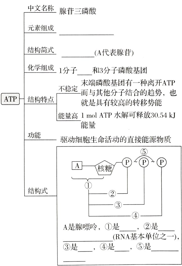 C、H、O、N、P A—P~P~P 腺苷 腺苷 腺嘌呤核糖核苷酸 ADP ATP 特殊的化学键