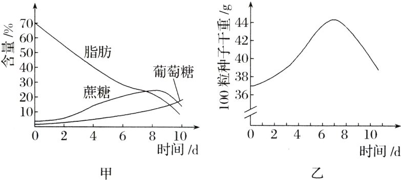 2.蓖麻种子的胚乳呈白色,脂肪含量占种子总质量的70%。为探究该植物种子萌发过程中的物质变化,某研究小组将种子置于温度、水分(蒸馏水)、通气等条件均适宜的黑暗环境中培养,定期检查萌发种子(含幼苗)的脂肪、蔗糖、葡萄糖的含量和干重变化,结果如图所示。