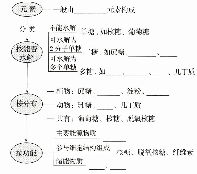 C、H、O 麦芽糖 乳糖 淀粉 纤维素 糖原 麦芽糖 纤维素 糖原 葡萄糖 淀粉 糖原