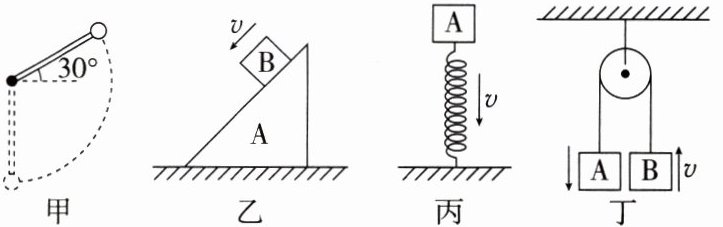 练1(2024·河南模拟)(多选)在如图所示的物理过程示意图中,甲图为一端固定有小球的轻杆,从右偏上 $30^{\circ}$ 角释放后绕光滑支点摆动;乙图中 A 置于光滑水平面,物体 B 沿光滑斜面下滑;丙图为物体 A 将弹簧压缩的过程中;丁图为不计任何阻力和定滑轮质量时,A 加速下落,B 加速上升过程中。关于这几个物理过程(空气阻力忽略不计),下列判断正确的是 (