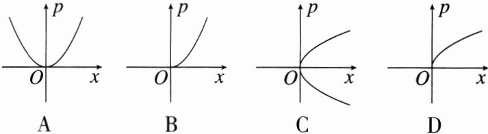 解析 根据题意,需要得到初速度为零的匀加速直线运动状态下的动量$p$和位移$x$的关系.根据动量的定义式$p = mv$及初速度为0的匀加速直线运动所满足的关系$v^2 = 2ax$,联立可得$p = \sqrt{2a} \cdot m(x)^{\frac{1}{2}}$,其中加速度$a$、质量$m$均不变,则动量$p$和位移$x$的关系式为幂函数,故物体对应的相轨迹为幂函数,D项正确.