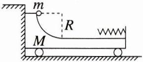 练 2(2024·黑龙江模拟)如图所示,光滑水平面上停放着一辆小车,小车的右端固定一轻质弹簧,左端紧靠墙壁但不粘连,小车的光滑 $ \frac{1}{4} $ 圆弧轨道在最低点与光滑水平轨道相切, $ \frac{1}{4} $ 圆弧轨道的半径为 $ R $,小车的质量为 $ M $。将质量为 $ m $ 的小球从圆弧轨道最高处由静止释放至弹簧首次恢复原长的过程中,有关小球、弹簧和小车组成的系统,下列说法正确的是(