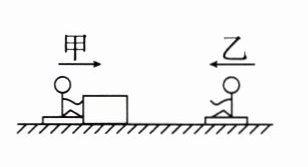 练 4 如图所示,甲、乙两小孩各乘一辆冰车在水平冰面上游戏。甲和他的冰车总质量为 $ M = 30 \, kg $,乙和他的冰车总质量也是 $ 30 \, kg $。游戏时,甲推着一个质量为 $ m = 15 \, kg $ 的箱子和他一起以 $ v_0 = 2 \, m/s $ 的速度滑行,乙以同样大小的速度迎面滑来。为了避免相撞,甲突然将箱子沿冰面推给乙,箱子滑到乙处,乙迅速抓住。(不计冰面摩擦)