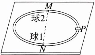 5. (2023·重庆)如图所示,桌面上固定有一半径为 $ R $ 的水平光滑圆轨道,$ M $、$ N $ 为轨道上的两点,且位于同一直径上,$ P $ 为 $ MN $ 段的中点。在 $ P $ 点处有一加速器(大小可忽略),小球每次经过 $ P $ 点后,其速度大小都增加 $ v_0 $。质量为 $ m $ 的小球 1 从 $ N $ 处以初速度 $ v_0 $ 沿轨道逆时针运动,与静止在 $ M $ 处的小球 2 发生第一次弹性碰撞,碰后瞬间两球速度大小相等。忽略每次碰撞时间。求:
