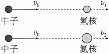 3. (2022·湖南)1932 年,查德威克用未知射线轰击氢核,发现这种射线是由质量与质子大致相等的中性粒子(即中子)组成。如图,中子以速度 $ v_0 $ 分别碰撞静止的氢核和氮核,碰撞后氢核和氮核的速度分别为 $ v_1 $ 和 $ v_2 $。设碰撞为弹性正碰,不考虑相对论效应,下列说法正确的是(