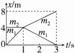 2. (2022·北京)质量为 $ m_1 $ 和 $ m_2 $ 的两个物体在光滑水平面上正碰,其位置坐标 $ x $ 随时间 $ t $ 变化的图像如图所示。下列说法正确的是(