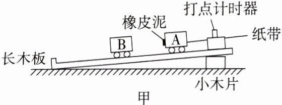 练1(2024·四川模拟)某同学设计了一个用打点计时器验证动量守恒定律的实验:在小车$A$的前端粘有橡皮泥,推动小车$A$使之做匀速运动。然后与原来静止在前方的小车$B$相碰并粘合成一体,继续做匀速运动,他设计的具体装置如图甲所示。在小车$A$后连着纸带,电磁打点计时器电源频率为$50Hz$。