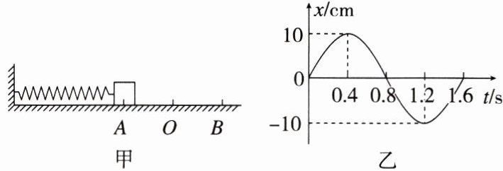 练3 (2023·重庆模拟)(多选)如图甲所示,弹簧振子以$O$点为平衡位置,在$A$、$B$两点之间做简谐运动。取向右为正,振子的位移$x$随时间$t$的变化如图乙所示,则由图可知(