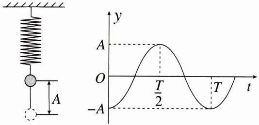 4. (2021·广东)如图所示,一个轻质弹簧下端挂一小球,小球静止。现将小球向下拉动距离$A$后由静止释放,并开始计时,小球在竖直方向做简谐运动,周期为$T$。经$\dfrac{T}{8}$时间,小球从最低点向上运动的距离