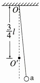 3. (2019·课标全国Ⅱ)如图,长为$l$的细绳下方悬挂一小球$a$,绳的另一端固定在天花板上$O$点处,在$O$点正下方$\dfrac{3}{4}l$的$O'$处有一固定细铁钉。将小球向右拉开,使细绳与竖直方向成一小角度(约为2°)后由静止释放,并从释放时开始计时。当小球$a$摆至最低位置时,细绳会受到铁钉的阻挡。设小球相对于其平衡位置的水平位移为$x$,向右为正。下列图像中,能描述小球在开始一个周期内的$x - t$关系的是(