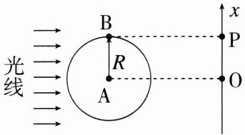 2. (2021·江苏)如图所示,半径为$R$的圆盘边缘有一钉子$B$,在水平光线下,圆盘的转轴$A$和钉子$B$在右侧墙壁上形成影子$O$和$P$,以$O$为原点在竖直方向上建立$x$坐标系。$t = 0$时从图示位置沿逆时针方向匀速转动圆盘,角速度为$\omega$,则$P$做简谐运动的表达式为(