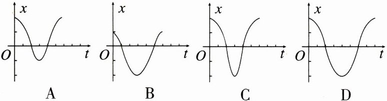 解析 由图可知,影子P做简谐运动的振幅为$R$,以向上为正方向,设P的振动方程为$x = R\sin(\omega t + \varphi)$,由图可知,当$t = 0$时,P的位移为$R$,代入振动方程解得$\varphi = \frac{\pi}{2}$,则P做简谐运动的表达式为$x = R\sin(\omega t + \frac{\pi}{2})$,故B项正确,A、C、D三项错误。故选B项。