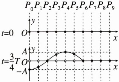 练1 (2022·北京) 在如图所示的$xOy$坐标系中,一条弹性绳沿$x$轴放置,图中小黑点代表绳上的质点,相邻质点的间距为$a$。$t = 0$时,$x = 0$处的质点$P_0$开始沿$y$轴做周期为$T$、振幅为$A$的简谐运动。$t = \frac{3}{4}T$时的波形如图所示。下列说法正确的是(