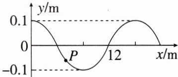 解析 由图可知$\frac{3}{4}\lambda = 12 m$,解得$\lambda = 16 m$,A项错误;由$v = \frac{\lambda}{T}$,得$T = \frac{\lambda}{v} = \frac{16}{2} s = 8 s$,B项正确;简谐运动的加速度总指向平衡位置,P点位于$y$轴负半轴,加速度方向沿$y$轴正方向,C项错误;P点位于$y$轴的负半轴,经过$2 s = \frac{T}{4}$,若波向$x$轴负方向传播,P向远离平衡位置方向振动,在$0~2 s$内质点P运动的路程有可能小于$0.1 m$,D项正确;故选B、D两项.