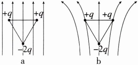 练4(2023·上海模拟)如图所示,$a$为匀强电场,$b$为非匀强电场,三个电荷用轻棒连接为正三角形,则整个系统受合力的情况是(