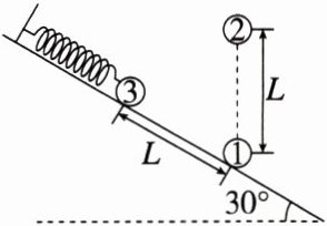 4.(2022·辽宁)(多选)如图所示,带电荷量为$6Q(Q > 0)$的球$1$固定在倾角为$30^{\circ}$光滑绝缘斜面上的$a$点,其正上方$L$处固定一电荷量为$-Q$的球$2$,斜面上距$a$点$L$处的$b$点有质量为$m$的带电球$3$,球$3$与一端固定的绝缘轻质弹簧相连并在$b$点处于静止状态。此时弹簧的压缩量为$\frac{L}{2}$,球$2$、$3$间的静电力大小为$\frac{mg}{2}$。迅速移走球$1$后,球$3$沿斜面向下运动。$g$为重力加速度,球的大小可忽略,下列关于球$3$的说法正确的是(