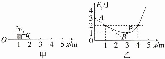 练11(2023·青海二模)(多选)如图甲所示,粗糙、绝缘的水平地面上,一质量$m=2 \mathrm{~kg}$的带负电小滑块(可视为质点)在$x=1 \mathrm{~m}$处以$v_{0}=1.5 \mathrm{~m} / \mathrm{s}$的初速度沿$x$轴正方向运动,滑块与地面间的动摩擦因数$\mu=0.05$。整个区域存在沿水平方向的电场,滑块在不同位置所具有的电势能$E_{\mathrm{p}}$如图乙所示,$P$点是图线最低点,虚线$AB$是图像在$x=1 \mathrm{~m}$处的切线,取$g=10 \mathrm{~m} / \mathrm{s}^{2}$,下列说法正确的是(