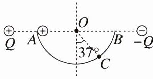 例2(多选)如图所示,两等量异种电荷在同一水平线上,它们连线的中点为$O$,竖直面内的半圆弧光滑绝缘轨道的直径$AB$水平,圆心在$O$点,圆弧的半径为$R$,$C$为圆弧上的一点,$OC$与竖直方向的夹角为$37^{\circ}$,一电荷量为$+q$,质量为$m$的带电小球从轨道的$A$端由静止释放,沿轨道滚动到最低点时,速度$v=2 \sqrt{g R}$,$g$为重力加速度,取无穷远处电势为零,则下列说法正确的是(