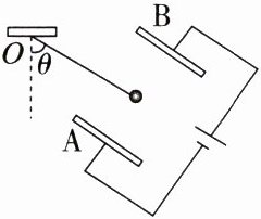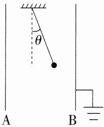 练6(2023·福州联考)如图所示,两平行金属板竖直放置且$B$板接地,其间有用绝缘细线悬挂的带电小球,当给两金属板充电$Q$后,悬线与竖直方向夹角为$\theta = \frac{\pi}{3}$,因电离作用,两金属板的电荷量缓慢减小(小球电荷量假设不变),以致悬线与竖直方向间的夹角逐渐减小,则在夹角减少到$\frac{\pi}{6}$的过程中,下列说法正确的是(