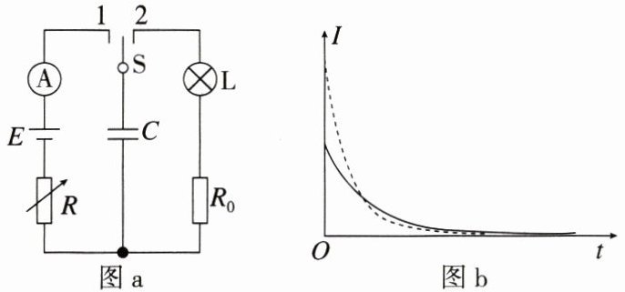 3. 将电阻箱的阻值调为$R_{2}(R_{2} > R_{1})$,再次将开关$S$与“$1$”端相接,再次记录电流随时间的变化情况。两次得到的电流$I$随时间$t$变化如图$b$中曲线所示,其中实线是电阻箱阻值为