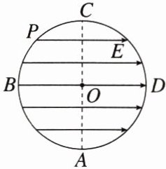 练3 (2023·湖北模拟)如图所示,光滑绝缘的水平桌面内有一圆形的匀强电场,场强大小为 $ E $,圆周外区域没有电场,$ O $ 为圆心,$ AC $、$ BD $ 为相互垂直的直径,$ P $ 为弧 $ BC $ 的中点,电场强度方向与直径 $ BD $ 平行。现有大量质量为 $ m $、电荷量大小为 $ q $(电性不同)的粒子以不同速率从 $ A $ 点沿 $ AO $ 方向射入匀强电场,不计粒子重力及粒子间相互作用,下列说法正确的是 (