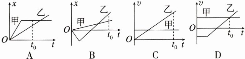 2. (2021·海南)(多选)甲、乙两人骑车沿同一平直公路运动,$t = 0$ 时经过路边的同一路标,下列位移—时间($x-t$)图像和速度—时间($v-t$)图像对应的运动中,甲、乙两人在 $t_0$ 时刻之前能再次相遇的是 (