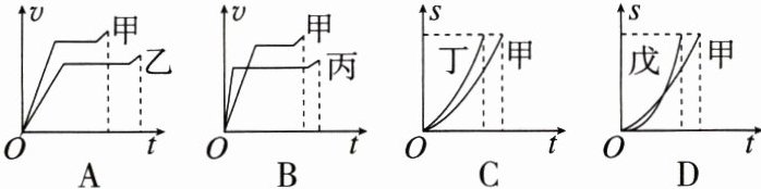 1. (2021·广东)(多选)赛龙舟是端午节的传统活动。下列 $v-t$ 和 $s-t$ 图像描述了五条相同的龙舟从同一起点线同时出发、沿长直河道划向同一终点线的运动全过程,其中能反映龙舟甲与其他龙舟在途中出现船头并齐的有 (