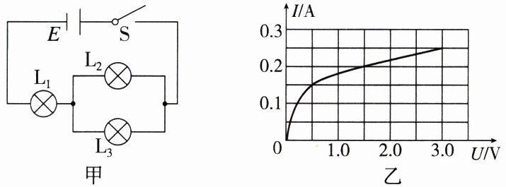 练5 (2022·深圳二模)(多选)在如图甲所示的电路中,$L_{1}$、$L_{2}$、$L_{3}$为三个相同规格的小灯泡,这种小灯泡的伏安特性曲线如图乙所示。当开关$S$闭合后,电路中的总电流为$0.25A$,则此时(