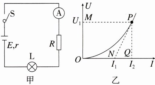 练4 (2022·唐山模拟)(多选)如图甲所示电路,小灯泡通电后其两端电压$U$随所通过的电流$I$变化的图线如图乙所示,$P$为图线上一点,$PN$为图线的切线,$PM$垂直于$U$轴,$PQ$垂直于$I$轴,当灯泡$L$两端的电压为$U_{1}$时,下列说法中正确的是(