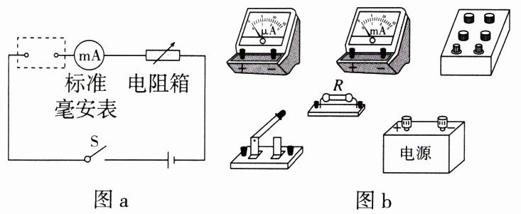 例2 (2019·课标全国Ⅰ)某同学要将一量程为$250\mu A$的微安表改装为量程为$20mA$的电流表。该同学测得微安表内阻为$1200\Omega$,经计算后将一阻值为$R$的电阻与该微安表连接,进行改装。然后利用一标准毫安表,根据图a所示电路对改装后的电表进行检测(虚线框内是改装后的电表)。